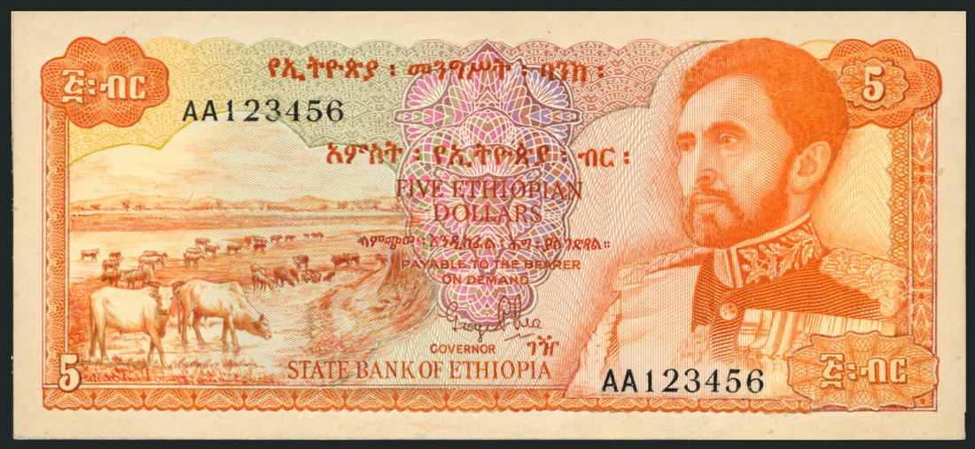 (†) State Bank of Ethiopia, a printers archival obverse and reverse essay on card for a $1, ND (8 April 1958), serial number AA 123456, green and pale pink, Emperor Haile Selassie at right, coffee bush at left, reverse green and red and lilac, value, also an obverse archival essay on card for a $5, ND (8 April 58), serial number AA 123456, orange and pale green and lilac, Emperor Haile Selassie at right, cattle at left