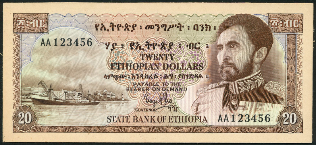 (†) State Bank of Ethiopia, an obverse composite essay on card for a 20 Dollars, ND (1958), serial number AA123456, signature George P. Rea, brown and multicoloured, unadopted portrait of Emperor Haile Selassie at right, cargo ship, church and waterfront at left