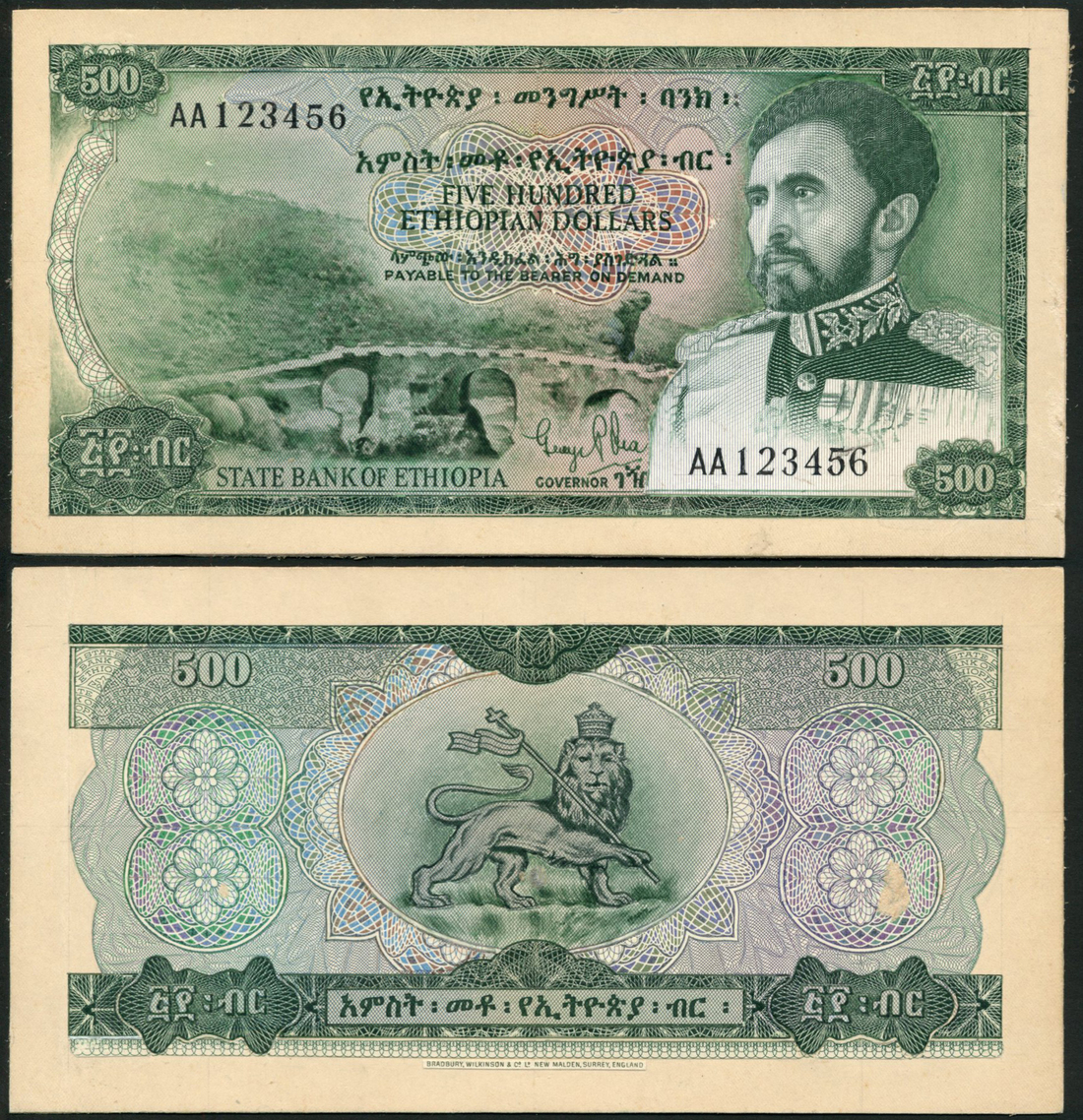 (†) State Bank of Ethiopia, an obverse and reverse composite essay on card for a 500 Dollars, ND (1957), serial number AA123456, signature George P. Rea, green and multicoloured, unadopted portrait of Emperor Haile Selassie at right, ancient bridge over river at left, reverse Lion of Judah