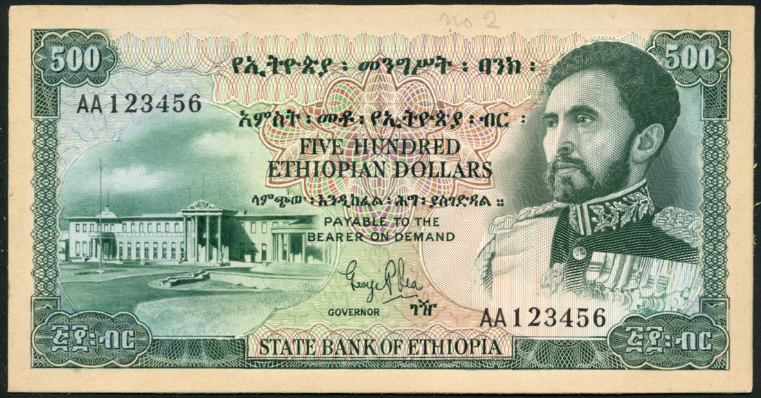 (†) State Bank of Ethiopia, an obverse composite essay on card for a 500 Dollars, ND (1958), serial number AA123456, signature George P. Rea, green and multicoloured, unadopted portrait of Emperor Haile Selassie at right, building at left,