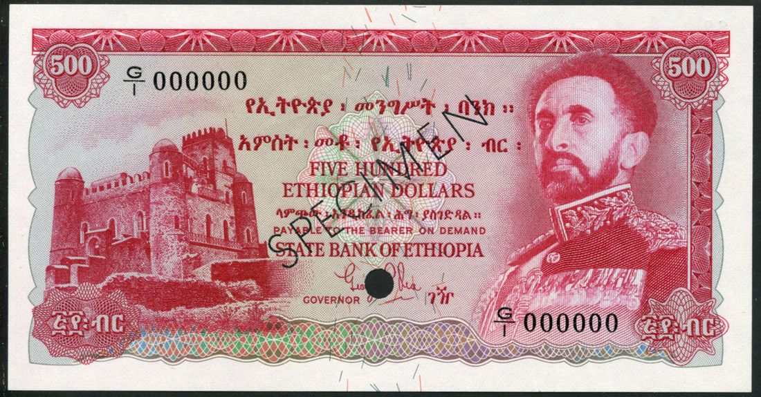 (†) State Bank of Ethiopia, a complete colour trial set of the 1961 issue, comprising $1, brown, $5, blue, $10, pink-purple, $20, olive green, $50, brown, $100, blue-green, and $500, red, all with Haile Selassie at right, reverse with lion and crown and sceptre at centre, all with cancellation hole and red or black SPECIMEN overprint