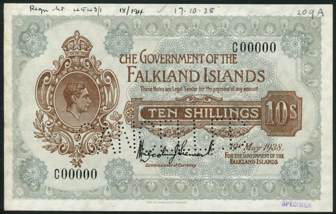 (†) Government of the Falkland Islands, specimen 10/-, 19 May 1938, serial number C00000, brown on grey and grey-green underprint, crowned portrait of George VI at left, value in tablet at right, perforated CANCELLED