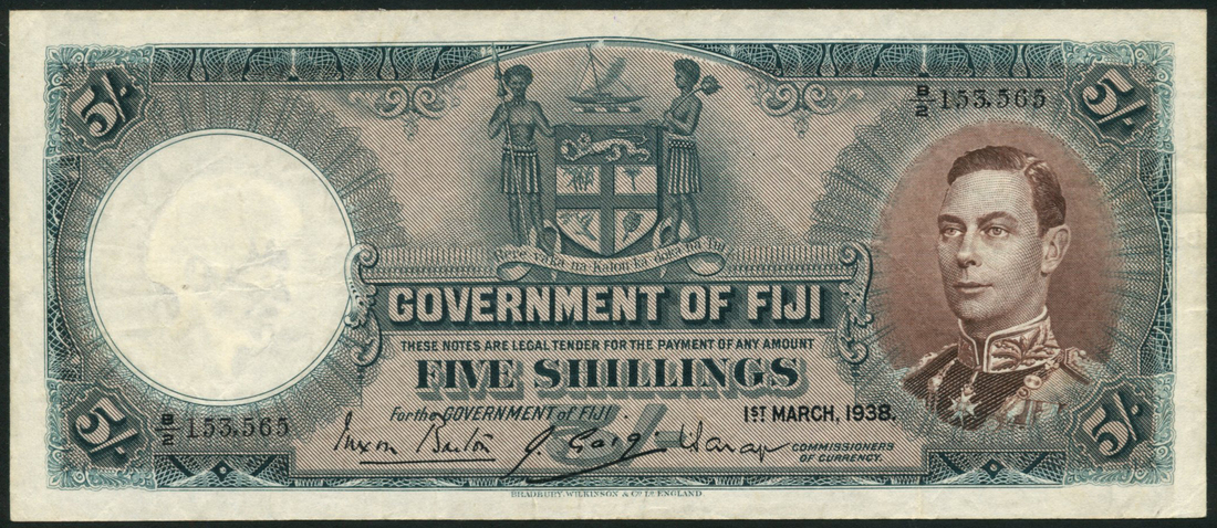 (x) Government of Fiji, 5 shillings, 1 March 1938, serial number B/2 153,565, blue and brown, portrait King George I in ornate frame at right, arms top centre, value in each corner and at centre, reverse, guilloche pattern