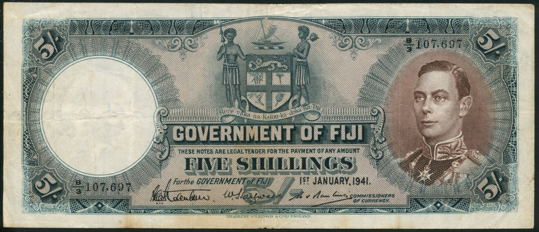 Government of Fiji, 5 shillings (2), 1 January 1941, serial number B/3 107,697, dark grey and light brown, portrait King George VI at right, and 1 October 1965, serial number C/15 81158, portrait Queen Elizabeth II at right, both arms top centre, reverses, guilloche pattern