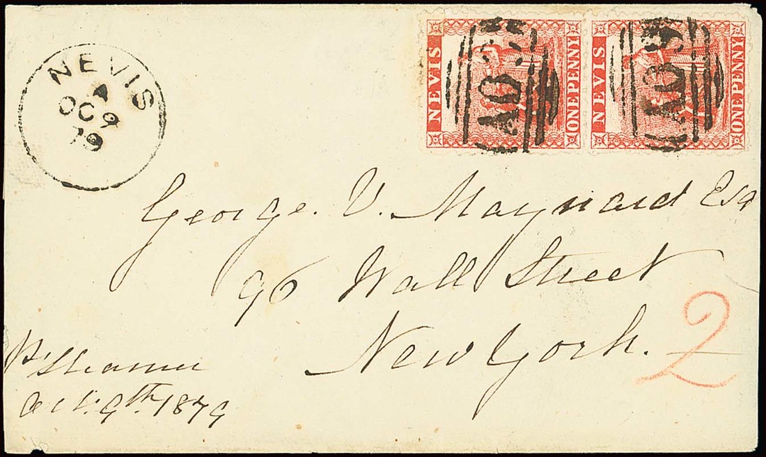 1879 (9 Oct.) envelope ex the "Maynard" correspondence to New York, bearing perf 11½ 1d. vermilion red vertical pair placed sideways and centrally cancelled "A09", showing red crayon "2", despatch c.d.s. and, on reverse, St. Thomas (Danish P.O.) transit c.d.s. (11.10) and arrival d.s. (27.10). Neat and attractive. A rare rate which only lasted one year (October 1879 until October 1880) and one of only three perf 11½ covers recorded. Photo