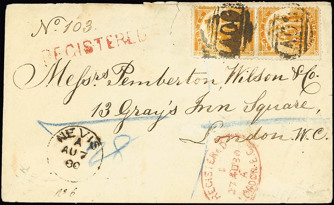 1880 (7 Aug.) envelope registered to London, bearing 4d. orange-yellow vertical pair placed sideways and tied by "A09" obliterator (heavy strike on the upper stamp), showing unframed "registered" h.s. in red, clear despatch c.d.s. and Registered arrival d.s. (27.8) in red. Very rare, one of only two registered covers recorded bearing "Medicinal Spring" stamps. Photo