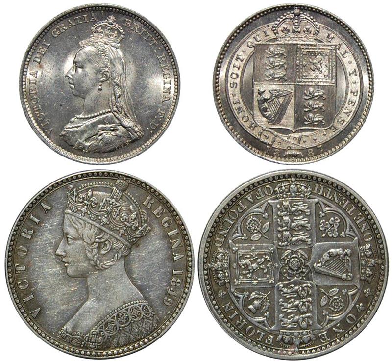 Great Britain, lot of 2 coins, 1849 'Godless' florin and 1887 one shilling,