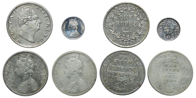 India, lot of 4x Silver coins, 2 annas 1890, Silver Rupee, 1835, 1892 and one from Bikanir State,