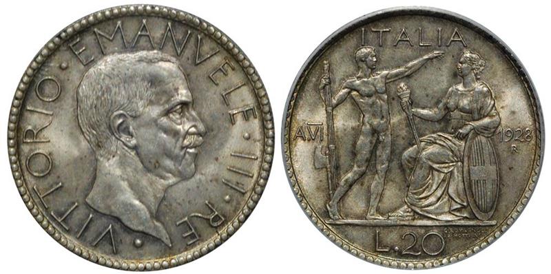 Italy, 20 lire, 1928-R, PCGS MS64, rare in this grade