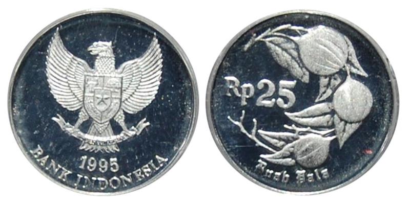 Indonesia, Aluminum 25 Rupiah, Proof, 1995, National emblem on obverse, reverse nutmeg, (KM 55), uncirculated.