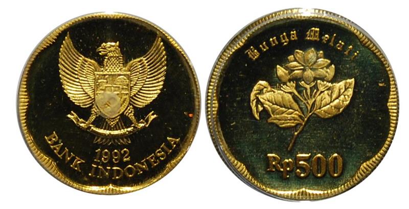 Indonesia, Aluminum-bronze 500 Rupiah, Proof, 1992, National emblem on obverse, reverse jasmine, (KM 54), uncirculated.