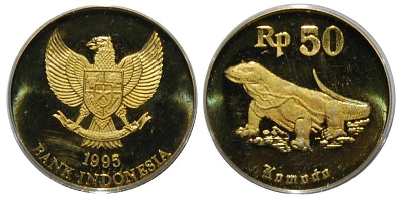 Indonesia, Aluminum-bronze 50 Rupiah, Proof, 1995, National emblem on obverse, reverse Komodo dragon, (KM 52), uncirculated.