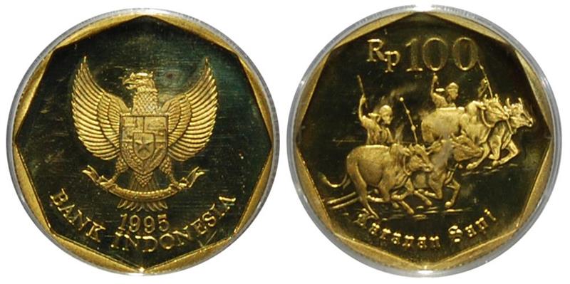 Indonesia, Aluminum-bronze 100 Rupiah, Proof, 1995, National emblem on obverse, reverse buffalo racing, (KM 53), uncirculated.