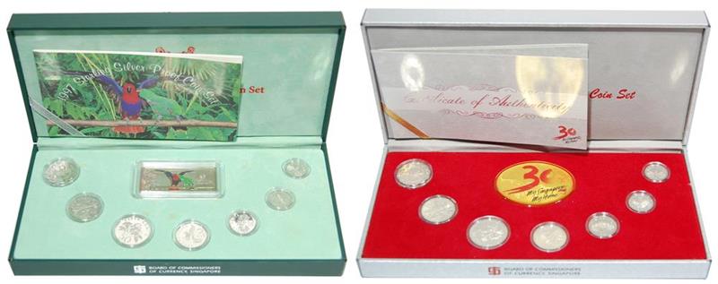 Singapore, 2 sets of Silver Proof coins including 1 cent, 5 cents, 10 cents, 20 cents, 50 cents, $1 and $2, 1995, 1997, all struck in Silver with certificates of authenticity and original boxes,(KM PS39, PS46), uncirculated.(2)uncirculated.(2)