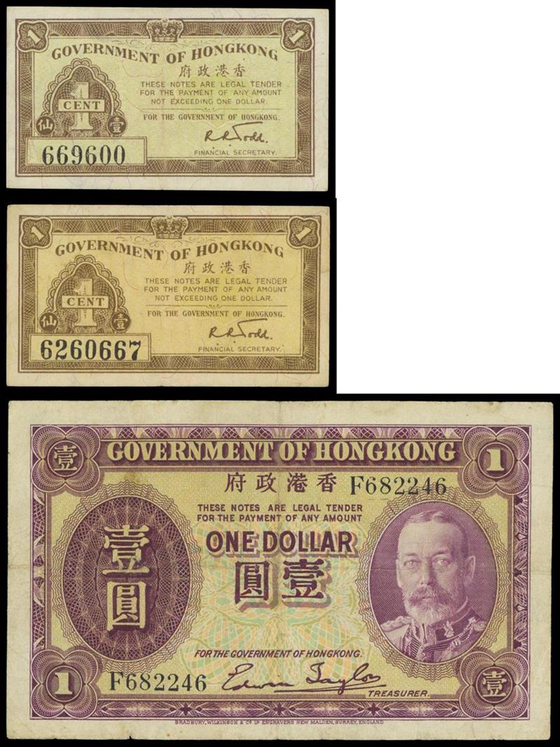 Hong Kong Government, mixed lot of 1 cent(2) and $1, ND(1941) and ND(1935), serial number 669600, 6260667 and F682246, brown and purple respectively,