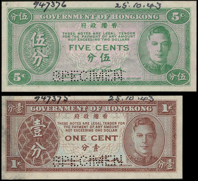 Government of Hong Kong, specimen 1 cent, brown and pale blue and specimen 5 cents, green, both ND (1945), both George VI at right