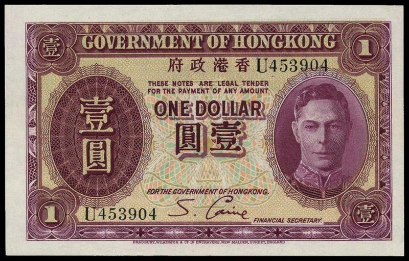 Government of Hong Kong, $1, ND (1936), serial number U 453904, purple and pale green, George VI at right, value at left