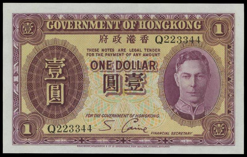 Government of Hong Kong, $1, 1936, serial number Q223344, pruple and yellow, George VI at right,
