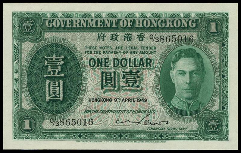 Government of Hong Kong, $1, 9 April 1949, serial number G/3 865016, green, George VI at right, value at left