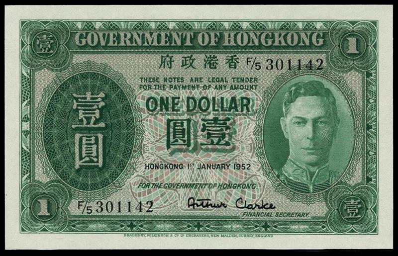 Government of Hong Kong, $1, 1 January 1952, serial number F/5 301142, green, George VI at right, value at left