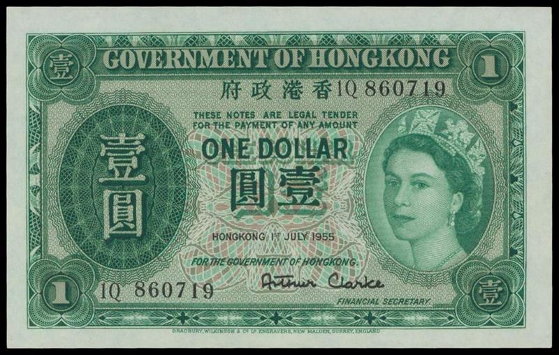 Hong Kong Government, $1, 1 July 1955, key date issue, serial number 1Q 860719, green on multicoloured underprint, Elizabeth II at right, value at left, reverse green,