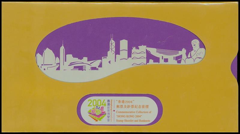 Government of Hong Kong, $10, 2002, serial number JJ810992, in a cardboard folder with a corresponding $10 stamp minisheet commemorating the Hong Kong stamp exposition in 2004,