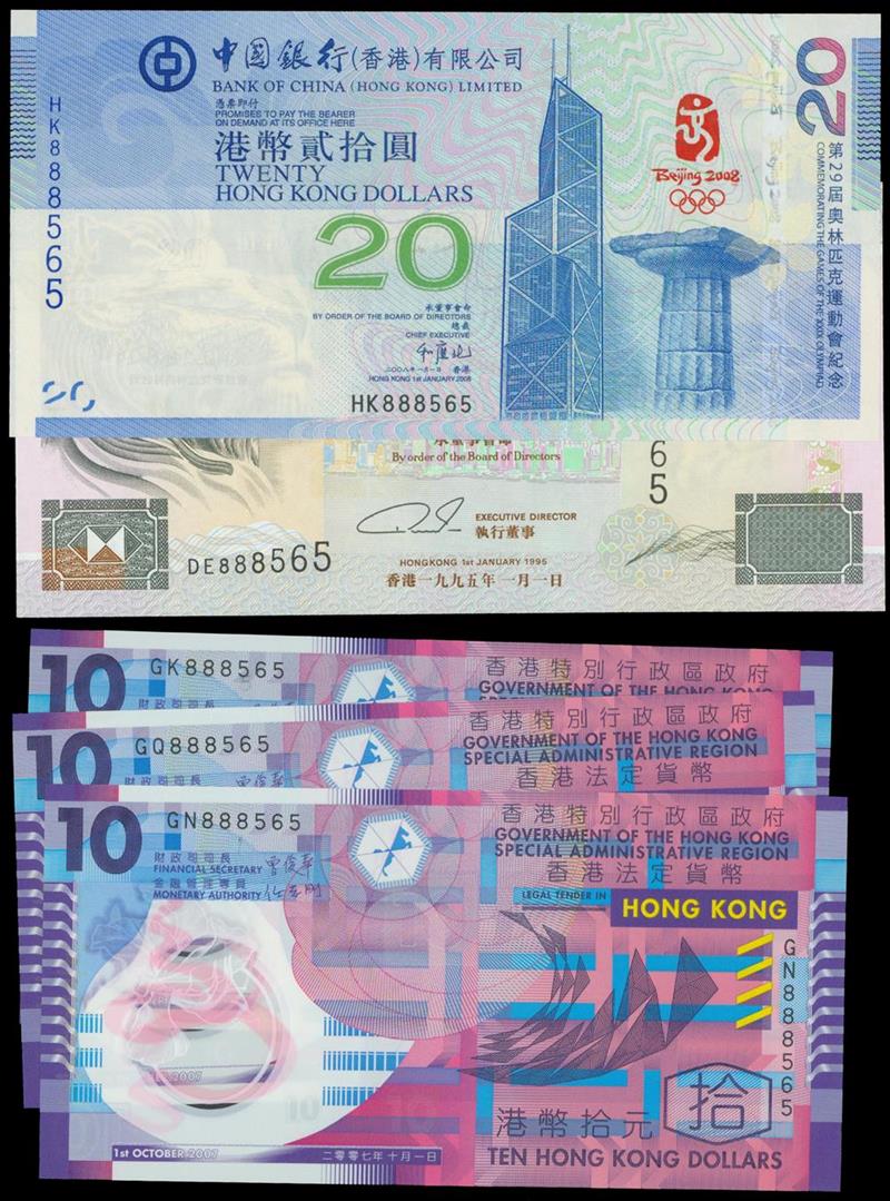 Government of Hong Kong and others, lot of 5 notes all with the same serial number (but different prefixes), 888565, $10 (3), HSBC $20 (1995) and Bank of China Olympics commemorative $20 (2008),