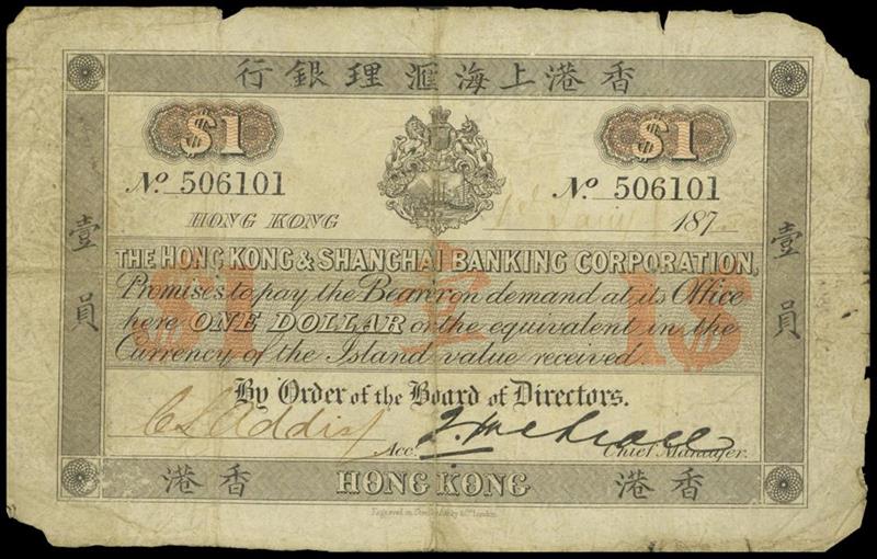 The HongKong and Shanghai Banking Corporation, $1, 187(9)?, serial number 506101, grey and red-orange underprint $1 and Chinese character, arms upper centre, reverse red-orange, coat of arms at centre,