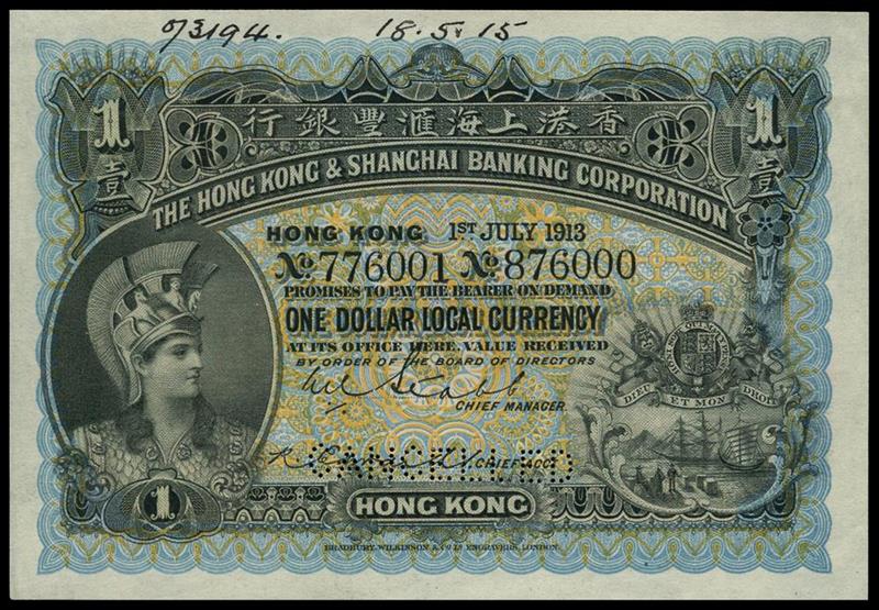 Hong Kong and Shanghai Banking Corporation, specimen $1, 1 July 1913, seral number 776001-876000, blue and pale orange, helmeted head of Minerva at low left, arms low right, , two printed signatures below, reverse red, maiden with lyre at centre, value at left and right