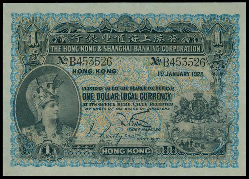 Hong Kong & Shanghai Banking Corporation, $1, 1 January 1925, serial number B453526, black on pale blue and multicoloured underprint, arms at low right, Minerva at left, reverse purple black, allegorical maiden at centre,