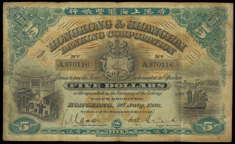 The HongKong and Shanghai Banking Corporation, $5, 1916, serial number A370116, olive and brown on orange underprint, water carrier at left, three mast ship at right, handsigned signature at bottom, reverse black and red, HSBC building at centre,