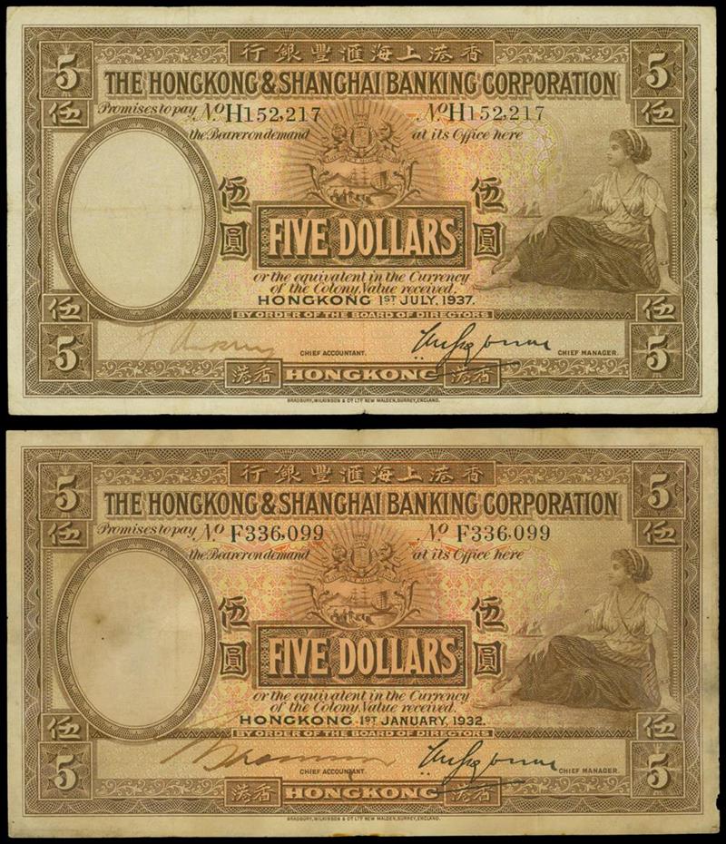The HongKong and Shanghai Banking Corporation, lot of 2x $5, 1932 and 1937, brown on muticoloured underprint, reclining maide at left, coat of arms top centre, reverse brown, angel playing trumpet above the old HSBC building, handsigned signature bottom left,
