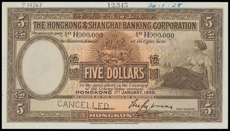 The HongKong and Shanghai Banking Corporation, $5, 'Specimen', 1938, brown and multicoloured, reclining maiden at right, coat of arms centrally and watermark of Minerva at left, reverse brown, old HSBC building at centre,