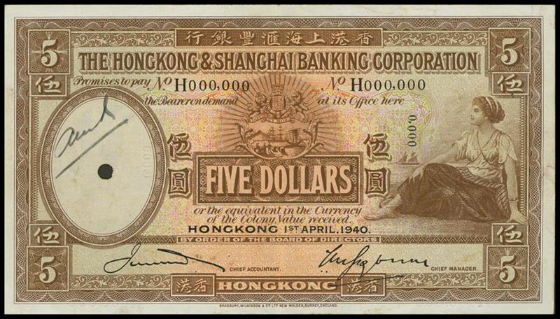 The HongKong and Shanghai Banking Corporation, $5, 'Specimen', 1940, with an addition coloumn of serial numbers, similar to that of duress notes, brown and multicoloured, reclining maiden at right, coat of arms centrally and watermark of Minerva at left, reverse brown, old HSBC building at centre, this note also comes with the original Bradbury Wilkinson envelope and dated '17.4.1940',