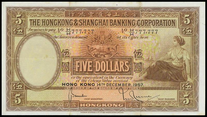 The HongKong and Shanghai Banking Corporation, $5, 1957, lucky serial number H/H777,777, own, pink and multicoloured, reclining maiden at right, coat of arms top centre, reverse brown, old HSBC building at centre,