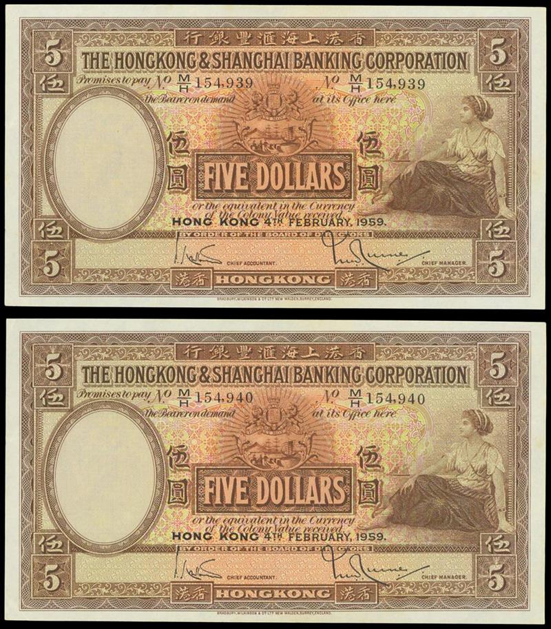 Hong Kong and Shanghai Banking Corporation, consecutive pair of $5, 4 February 1959, serial number M/H154939-40, brown on multicolour underprint, maiden at right, arms top centre, value at centre and each corner, two printed signatures, reverse brown and multicoloured, bank building at centre, angel above,