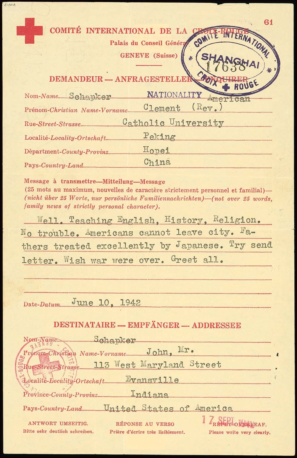 Peking Religious Residence: 1942 (10 June) Red Cross lettersheet from Rev. Clement Schapker to Indiana, U.S.A. and bears a fine strike of oval "comite international/shanghai/croix rouge" in purple and circular Geneva Red Cross handstamp in red with date "17 SEPT 1942"; good.