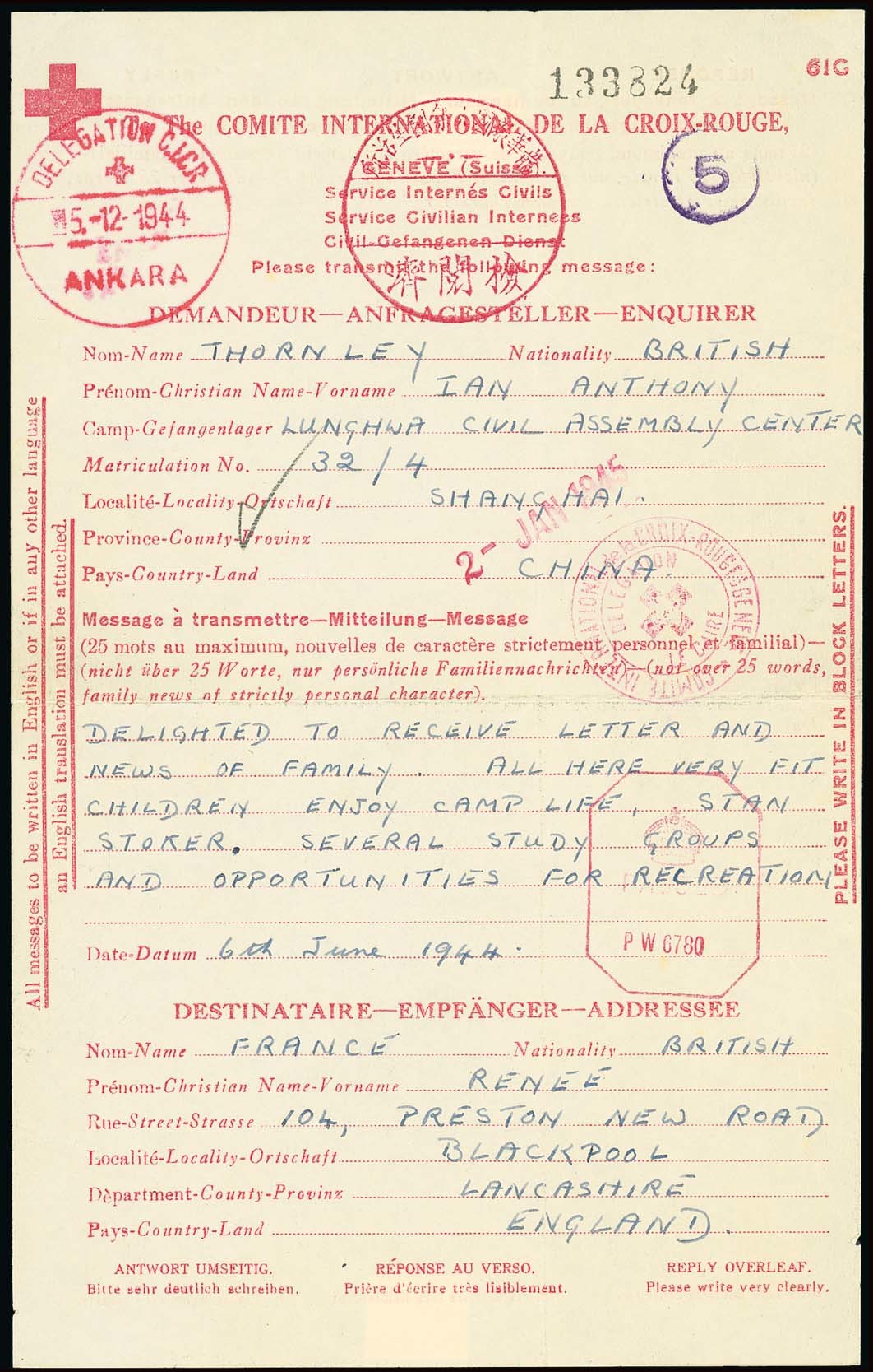 Shanghai - Lunghwa: 1944 (6 June) Red Cross lettersheet from Ian Thornley to Blackpool bearing a good strike of the Lunghwa circular censor handstamp, Red Cross Ankara handstamp (15.12), Geneva Red Cross handstamp (2.1) and British censor "P.W. 6780"; fine. Tett fig. 4-8-39. Photo