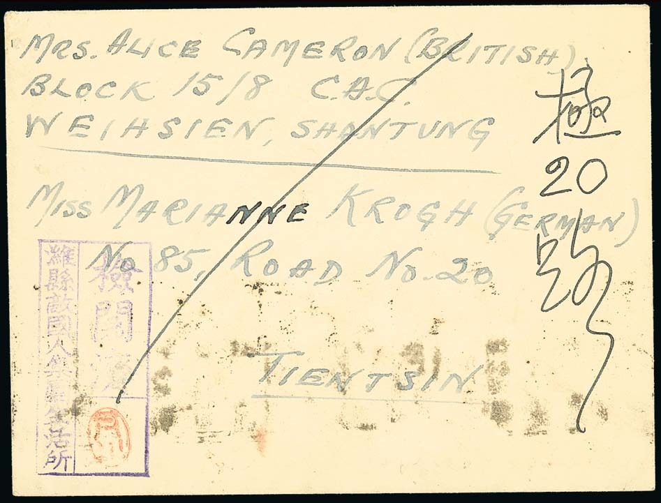Weihsien: 1944 (4 Feb.) envelope from Alice Cameron to a German friend in Tientsin bearing a good strike of boxed Weihsien Enemy Civilian Assembly Centre censored handstamp in violet with Tsukikawa seal, the reverse with pairs of 4c. on 8c. and 5c. on 10c. tied by the despatch c.d.s. and indistinct Tientsin roller postmark. Fine. Tett fig. 4-8-27. Photo
