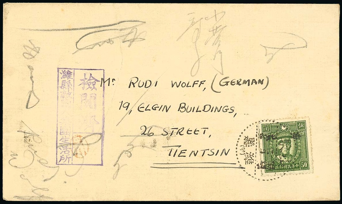 Weihsien: 1945 (6 Feb.) envelope from Elinor Clarke to a German friend in Tientsin bearing 50c. tied by the despatch c.d.s. and showing a good strike of the boxed Weihsien Civilian Assembly Centre censor handstamp with Tsukikawa seal and, on the reverse, Tientsin roller cancellation (24.2). Tett fig 4-8-32. Photo