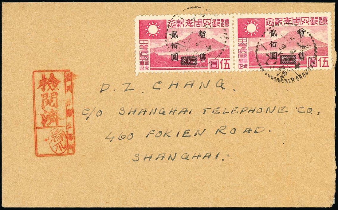 Yangchow: 1945 (6 July) envelope from A. McGregor to a friend in Shanghai bearing pair of $200 on $5 Anniversary stamps tied by dotted c.d.s. and showing a good strike of Yangchow Civilian Assembly Centre censor handstamp in orange with Hashizume seal. Fine. Tett fig. 4-8-25. Photo