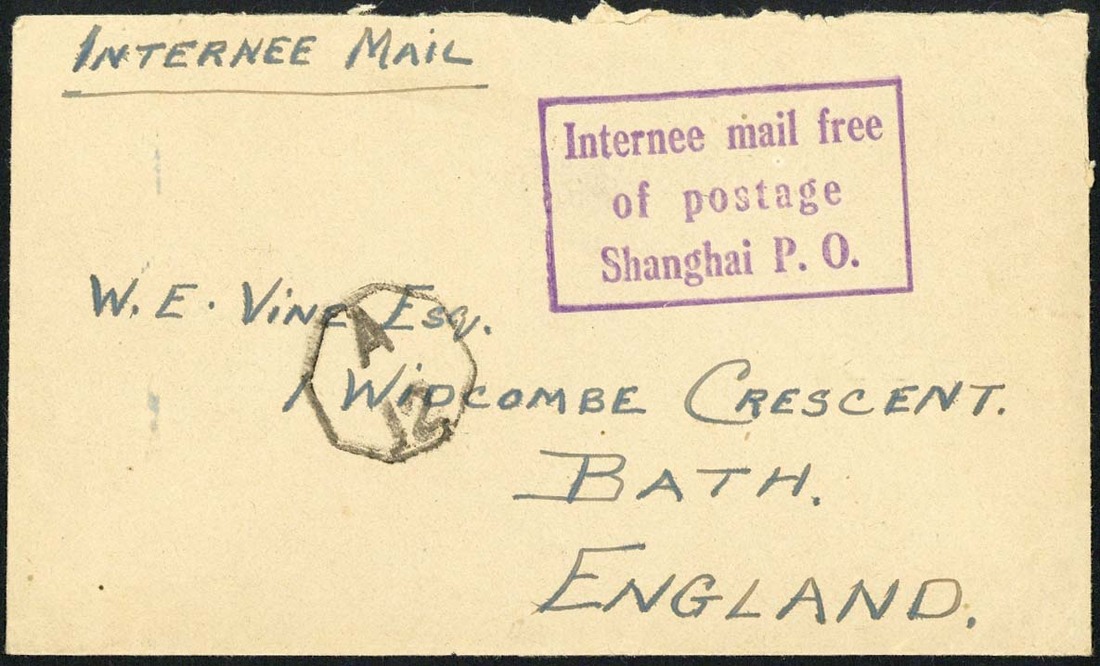 1945 (5 Sept.) envelope from Ernest Jones still in Lincoln Avenue Camp, to Bath by "Internee Mail" and with a fine strike of the boxed "Internee/mail free/of postage/Shanghai P.O." in purple with "A/2" in hexagon (an Indian mark applied in Calcutta) and, on the reverse, Shanghai c.d.s. A good cover. Tett fig. 4-12-4. Photo