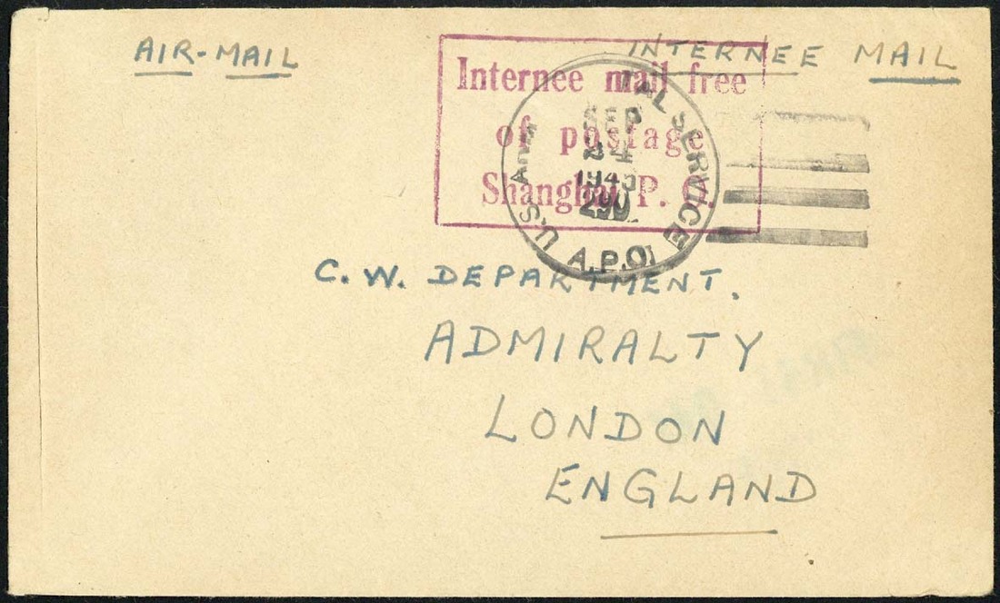 1945 (24 Sept.) envelope from Stefanie Goldstein sent air mail to the Admiralty in London bearing a good strike of the boxed "Internee mail free/of postage/Shanghai P.O." handstamp in mauve, overstruck by "u.s. army postal service/a.p.o. duplex. Good. Tett fig. 1-12-5. Photo