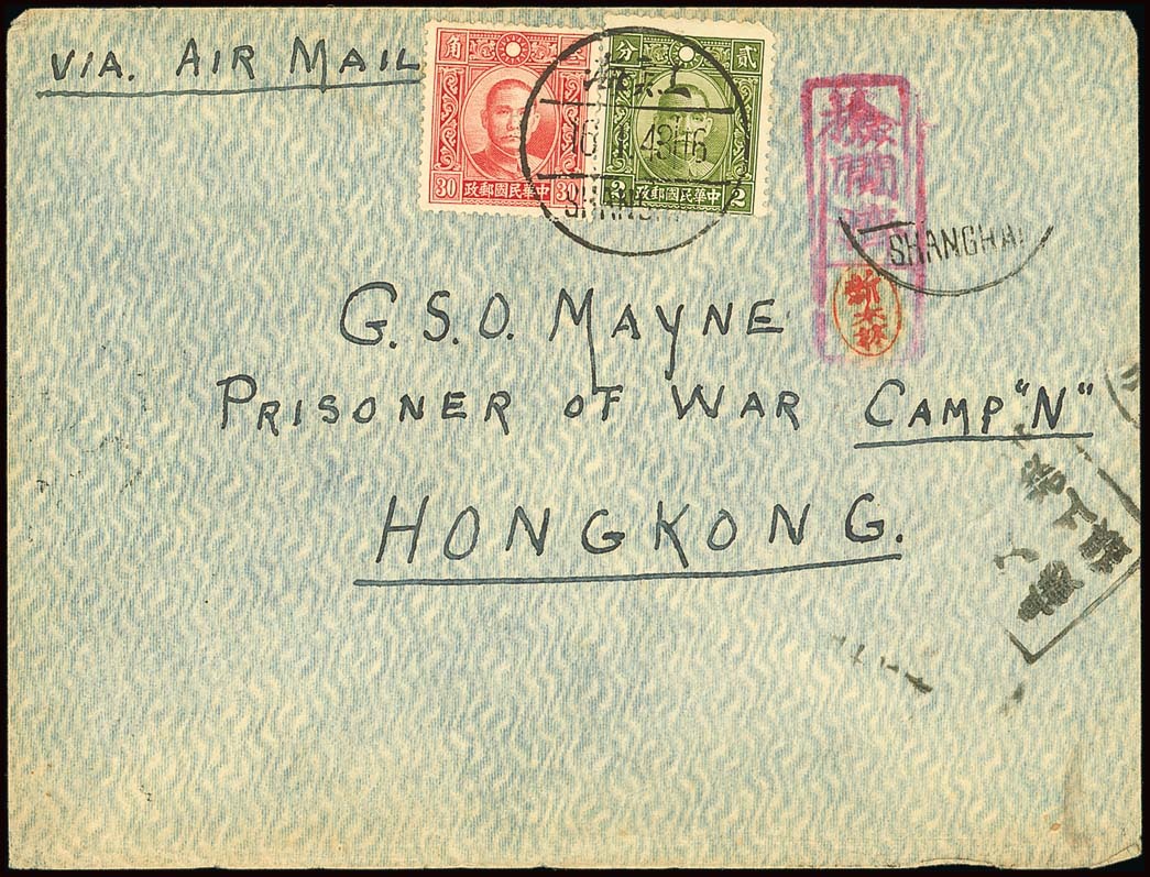 From China: 1943 (16 Jan.) envelope from Shanghai bearing Sun Yat Sen 2c. and 30c. (a further 20c. stamp fell off in transit) and sent by air mail to G.S.O. Mayne in Camp N, bearing an indistinct Canton transit datestamp and with boxed censored handstamp in rose with small Niimori seal. Good to fine. Tett fig. 4-2-21. Photo