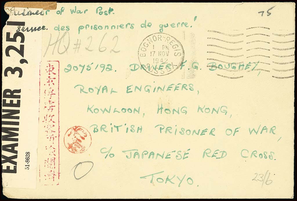 From U.K.: 1942 (17 Nov.) stampless envelope to Driver Boughey, Royal Engineers, Kowloon, sent "Prisoners of War Post" with Bognor Regis machine cancellation and British censor seal at left. Marked "HQ#262" in pencil (Headquarters Camp) and with a fair strike of Tokyo Prisoner of War handstamp in carmine-rose with Ichimura seal alongside and pencil "O". With the original letter from his mother besring Tokyo handstamp and seal. Tett fig. 4-2-11. Photo