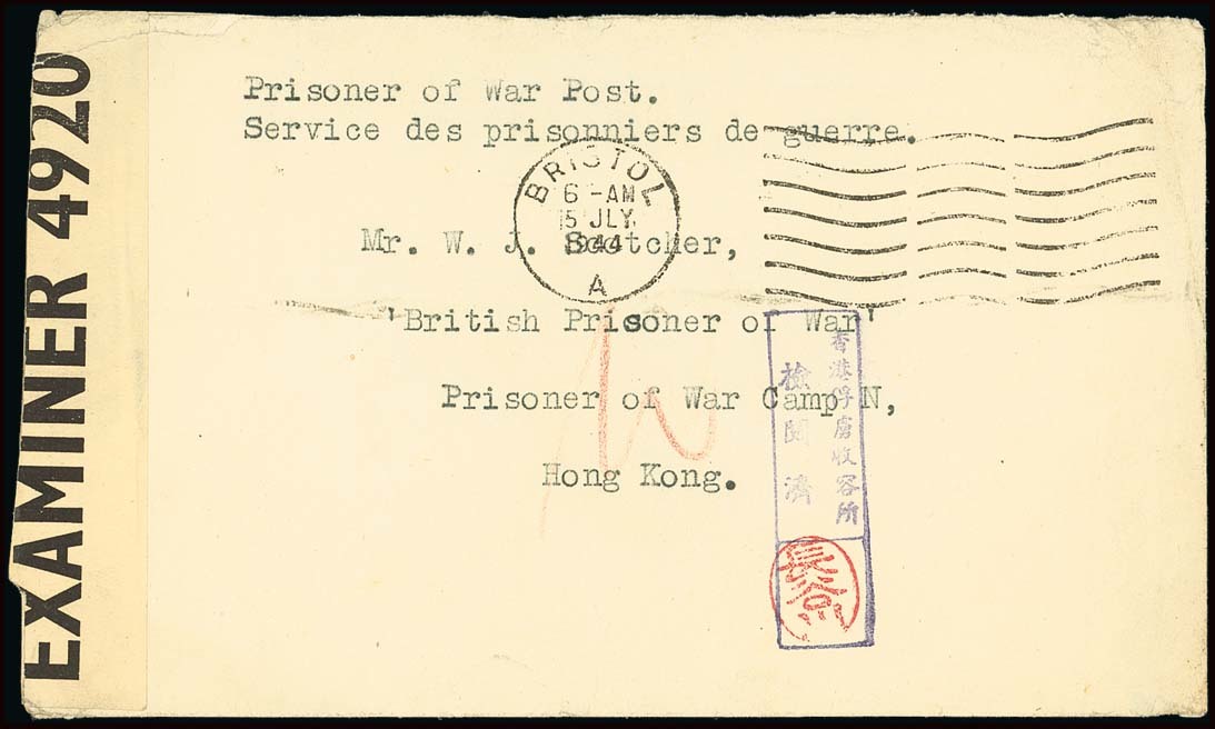From U.K.: 1944 (5 July) stampless, opened-out envelope to W. Scotcher by "Prisoner of War Post" bearing Bristol machine cancellation and British censor seal at left, manuscript "N" in red crayon and a good strike of Prisoner of War censor handstamp in purple with large Hasegawa seal. Good. Tett fig. 4-2-29. Photo