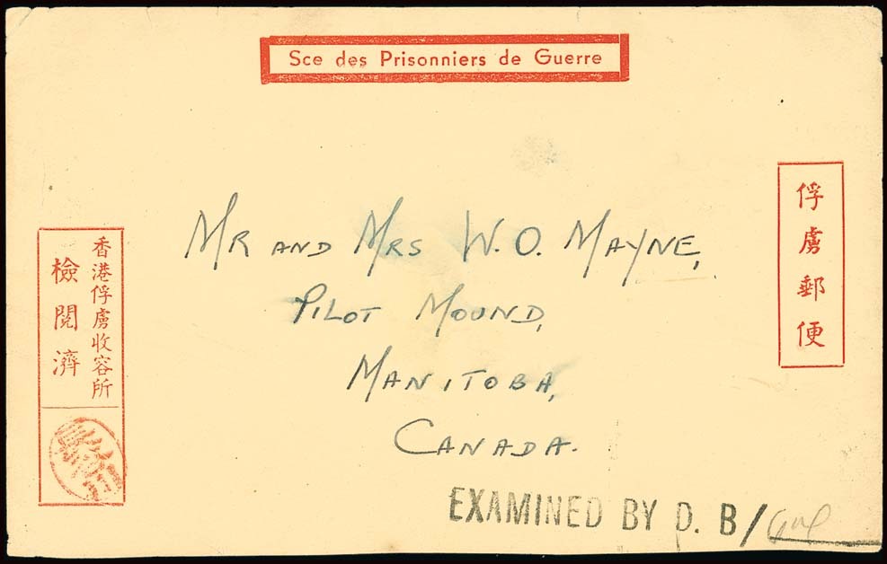 1944 (c.) type 2 card from William Mayne to his parents in Canada, bearing large Hasegawa seal and Canadian censor handstamp, the message side with Pilot Mound 1945 (8 Feb.) arrival c.d.s. Good to fine. Tett fig. 4-3-27. Photo