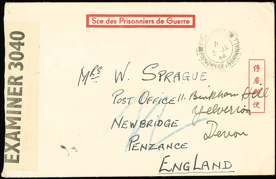 1942 (late) type 1 envelope from W. Sprague to Penzance with British censor label at left covering large Niimori seal, readdressed on arrival with Penzance 1944 (3 Jan.) c.d.s. Fresh. Tett fig. 4-3-13. Photo