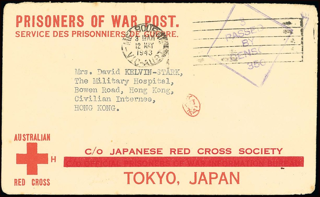 From Australia: 1943 (12 May) Australian Red Cross Prisoners of War Post envelope addressed to Mrs David Stark, Civilian Internee, Melbourne machine postmark and diamond censor "350" in violet, with censor seal and handstamp across the flap, small Takamatsu seal in red (no camp censor handstamp). Light wear around the edges but still fresh. A very scarce cover to the military hospital. Tett fig. 4-4-24. Photo