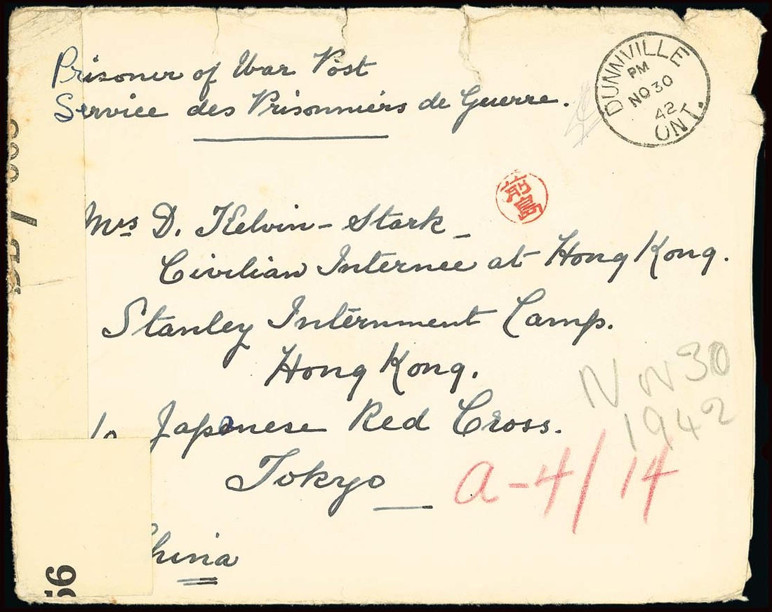 From Canada: 1942 (30 Nov.) larger stampless envelope to Mrs Kelvin-Stark bearing a fine Dunnville c.d.s. and sent by Prisoner of War Post, with Canadian censor seal at left, "a-4/14" in red crayon (the block and room number) and Maejima seal ; some peripheral faults. Tett fig. 4-4-17. Photo
